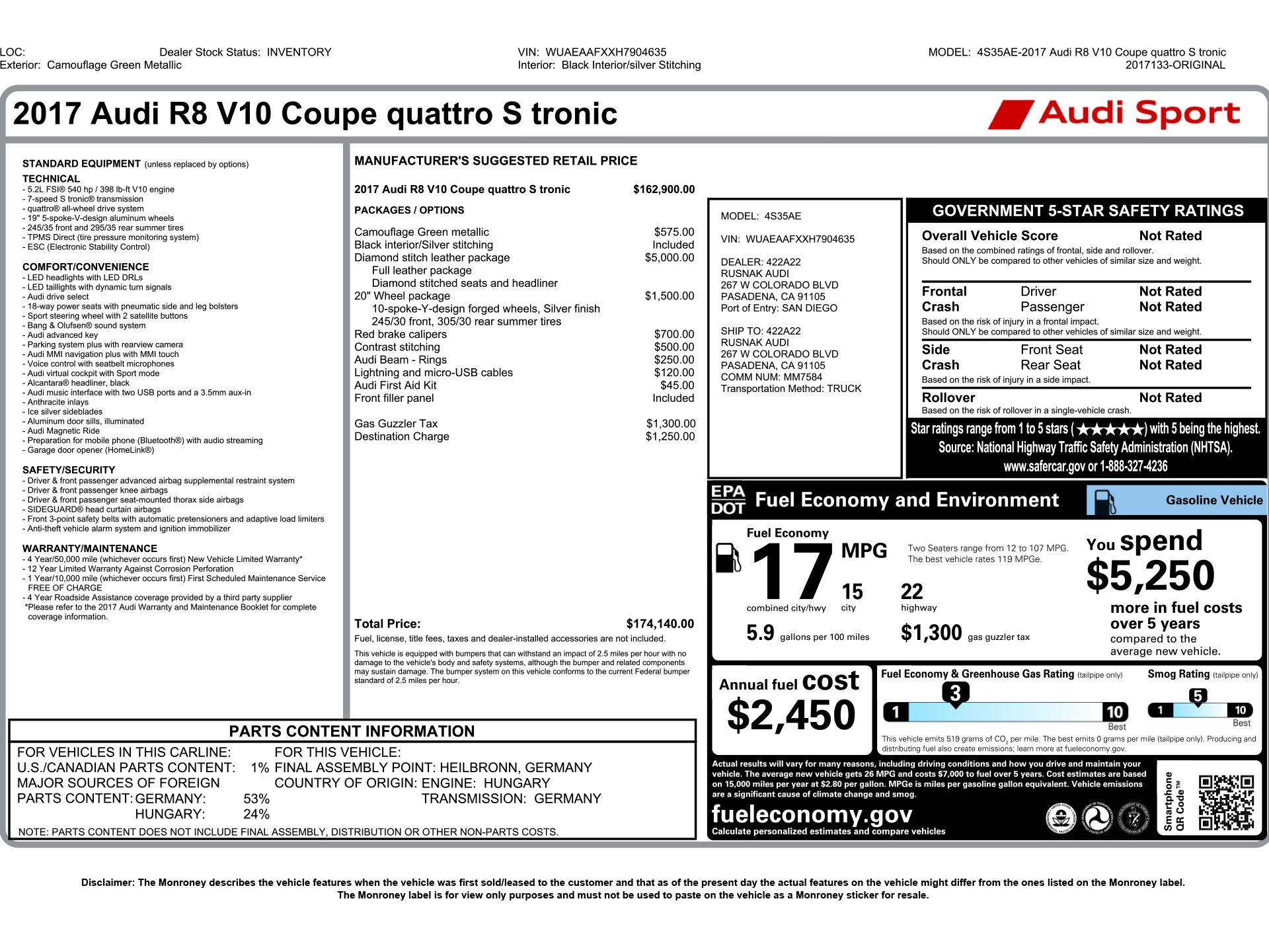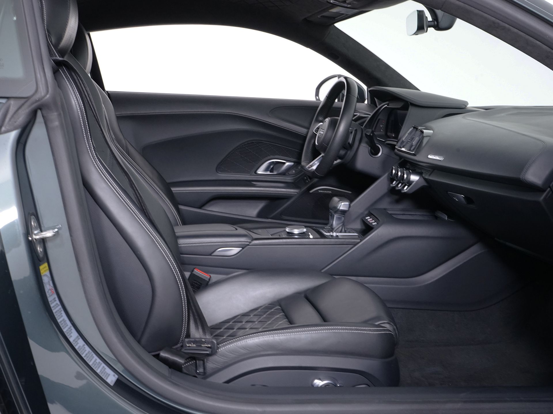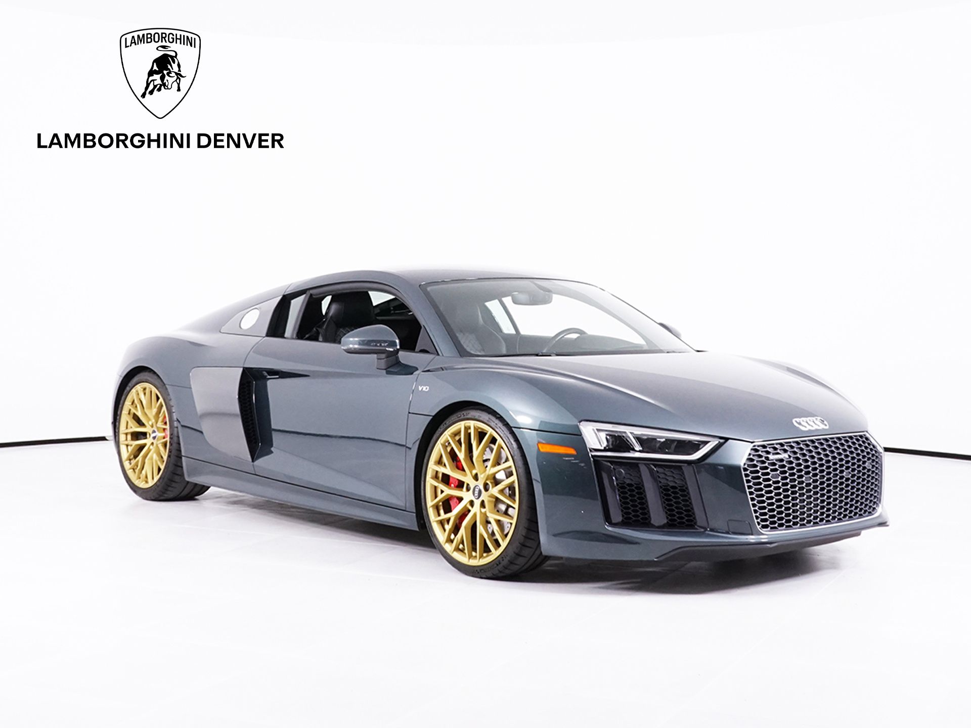 Camouflage Green Metallic/Black Roof 2017 Audi R8 5.2 quattro quattro 7-Speed Automatic S tronic 5.2L V10 FSI DOHC Black / Silver Stitching w/Leather Diamond Stitch Seats, 13 Speakers, 20" Wheel Package, Adaptive suspension, Alcantara Headliner w/Diamond Stitching, Automatic temperature control, Brake assist, Contrast Stitching, Diamond Stitch Leather Package, Electronic Stability Control, Exterior Parking Camera Rear, Full Leather Package, Heated front seats, Heated Front Sport Bucket Seats, Illuminated entry, Leather Diamond Stitch Seats, Navigation System, Remote keyless entry, Wheels: 20" 10-Spoke-Y-design Forged Silver Alloy.Recent Arrival! Odometer is 15295 miles below market average!