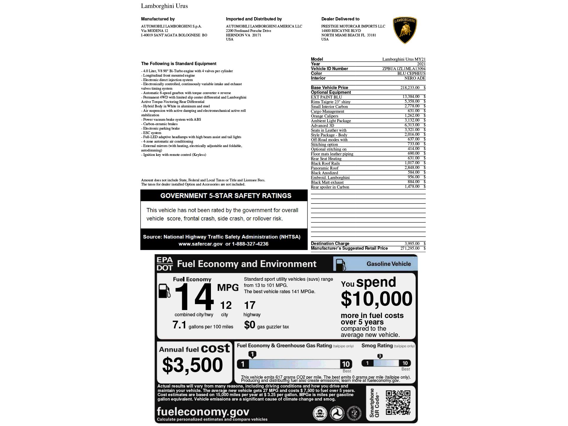 Blu Cepheus Pearl 2021 Lamborghini Urus AWD 8-Speed Automatic V8 ABS brakes, Active Cruise Control, Advanced 3D Bang & Olufsen Sound System, Ambient Light Package, Black Anodized Treatment on Aluminum Inserts, Black Matt Exhaust Tailpipes, Black Roof Rails, Body Color Style Package, Brake assist, Compass, DVD-Audio, Electronic Stability Control, Emergency communication system, Front dual zone A/C, Heated door mirrors, Heated Front Bucket Seats, Heated front seats, Illuminated entry, Low tire pressure warning, Navigation System, Panoramic Sunroof, Power Liftgate, Rear dual zone A/C, Remote keyless entry, Small Interior Carbon Package, Traction control, Wheel Arches in Body Color, Wheels: 23" x 10J Fr & 23" x 11.5J Rr Taigete Shiny Blk.Recent Arrival!