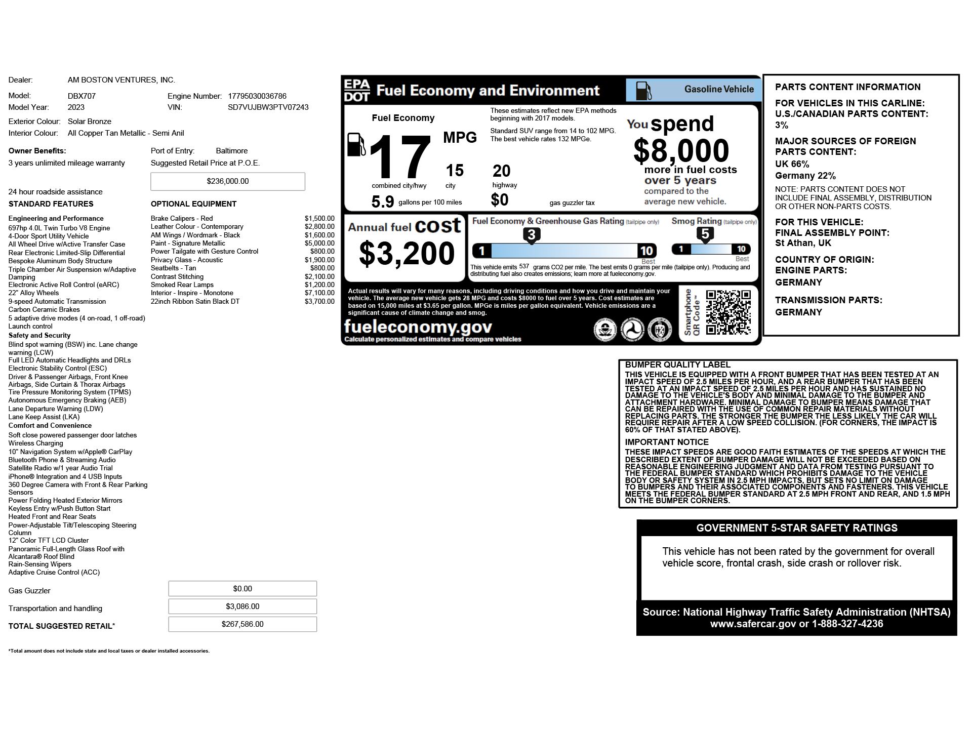 Certified. Solar Bronze 2023 Aston Martin DBX 707 AWD 9-Speed Automatic 4.0L V8 14 Speakers, Acoustic Rear Privacy Glass, Automatic temperature control, Brake assist, Contrast Stitching, Electronic Stability Control, Heated rear seats, Heated Seats, Micro-Perforated Leather/Alcantara Seat Trim, Navigation System, Power Liftgate, Power Tailgate w/Gesture Control, Remote keyless entry, Wheels: 22" Ribbon Satin Black Diamond Turned.Recent Arrival! Odometer is 1724 miles below market average!Timeless Certified Pre-Owned Details: * Warranty Deductible: $0 * Roadside Assistance * Limited Warranty: 12 Month/Unlimited Mile * 12 months Roadside Assistance. Servicing completed, including any service due within 3 months or 3,000 miles. * Vehicle History * Multipoint Point Inspection * Transferable Warranty